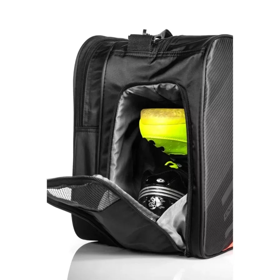 Diese Badmintontasche bietet Platz für eine Menge Ausrüstung. Sie verfügt über zwei große Fächer, die sowohl Ihren Badmintonschläger als auch Ihre gesamte Ausrüstung aufnehmen können. Eines der großen Fächer ist für die Aufbewahrung Ihrer Schläger vorgesehen. In diesem Fach befindet sich auch eine große Netztasche, in der Sie kleinere Accessoires verstauen können. Das andere große Fach bietet Platz für Trainingskleidung, Federbälle und vieles mehr. Zusätzlich gibt es ein belüftetes Schuhfach an der Seite der Tasche.